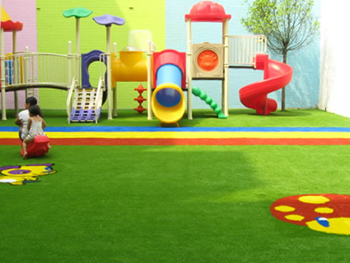 綠舒坦幼兒園人造草坪,SGS不含鉛等重金屬,不含甲醛,且幼兒園仿真草坪全部采用環保背膠。更有彩虹草和彩虹跑道,豐富寶寶的幼兒園色彩。綠舒坦幼兒園人造草坪高密度直曲草絲混織,保護寶寶免受摔倒損傷。